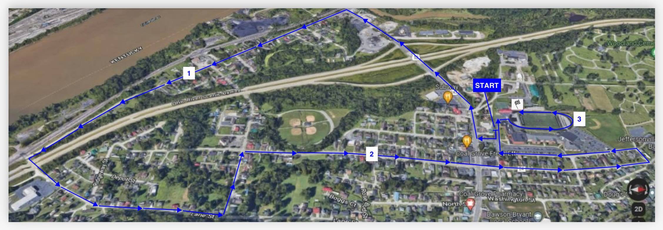 Race starts and ends on the Coal Grove High School track. Runners and walkers will be running thru the streets of Coal Grove.