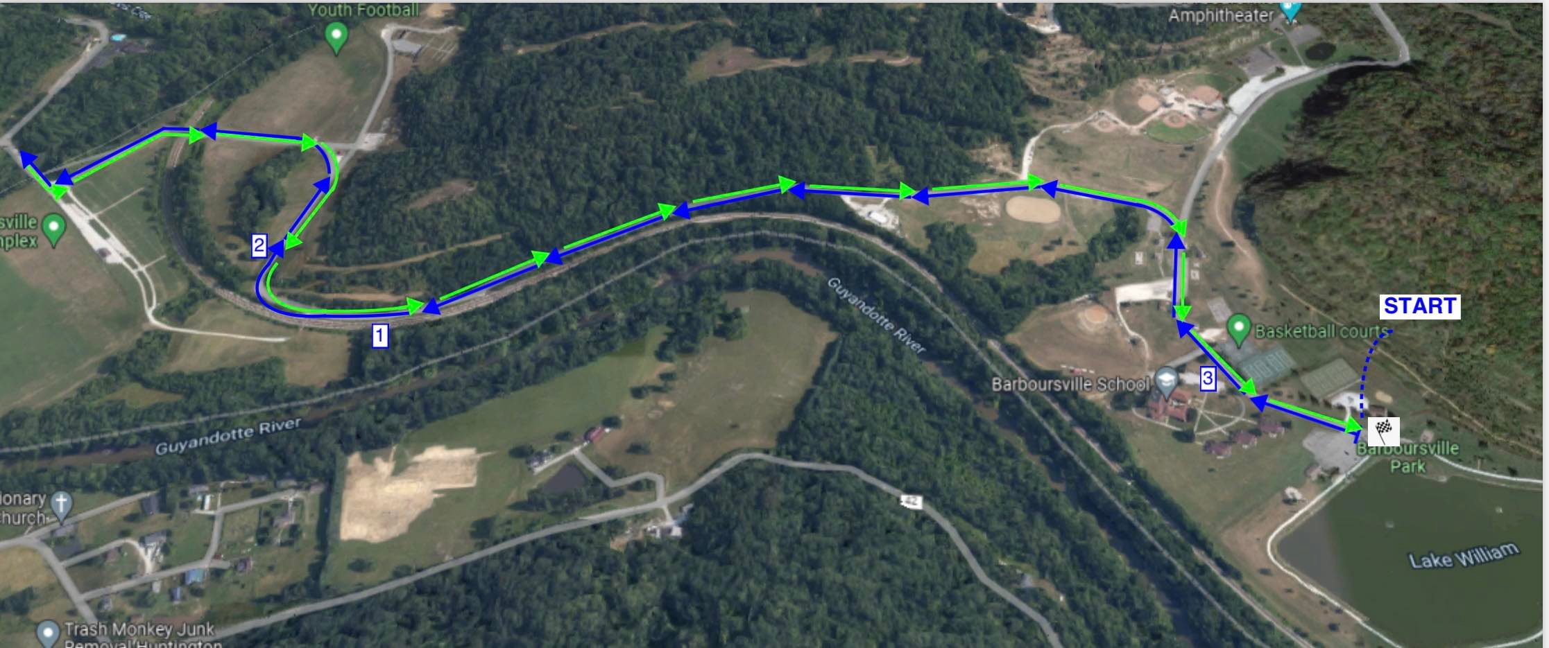 Start at the lake > out to the soccer field road > over the bridge > .5 mile to the right > turn around > return to the lake to finish.