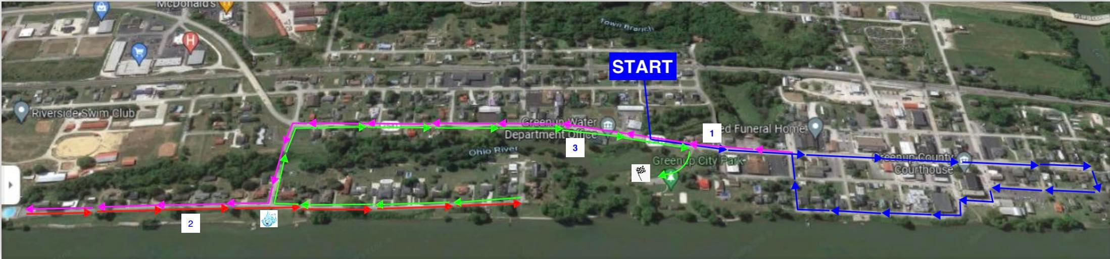 Starts and ends in the Greenup City Park. Two long scenic sections of the course run right along the river