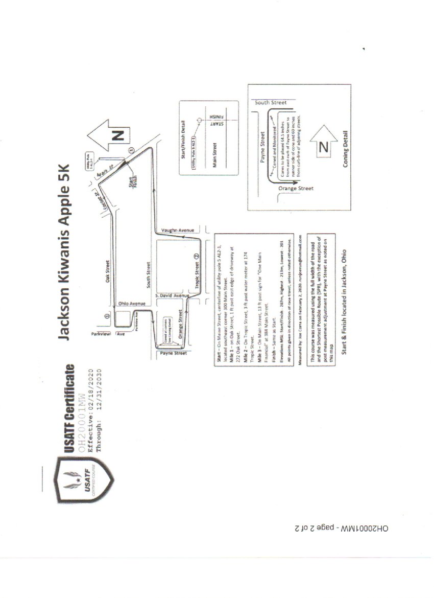A USTF Certfed Coures thorugh the streets of Jackson, Ohio. The start and finish are on the Apple Festival midway. The course is rolling with no major hills. In 2024 Corey Clubertson was first overall with a time of 18:34, Emma Phillips was the first female with a time of 22:51 and Sherman Henderson was the first walker with a time of 44:10.