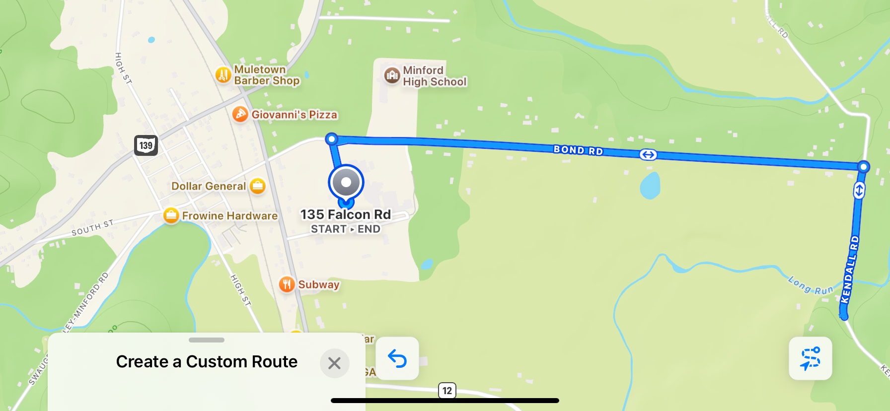 The course starts at Minford Primary School, follows Bond Rd with a right turn, continues with another right onto Kendall Rd, then proceeds to the turnaround point before heading back to finish at the school.